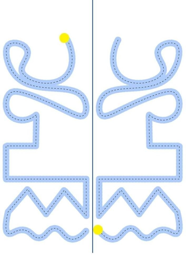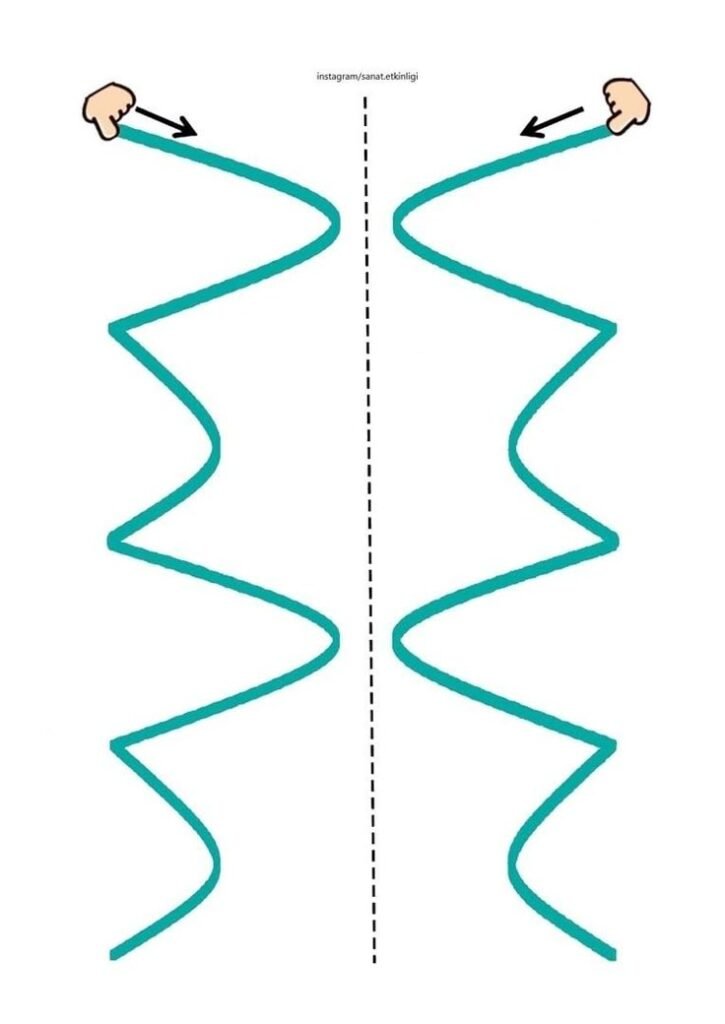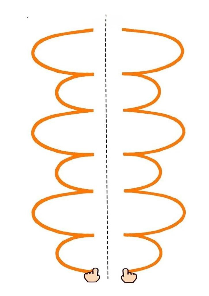 A képen látható feladatban a gyerekeknek a két oldalt kell végigkövetniük: a bal és a jobb oldal útvonala szimmetrikusan ismétli egymást.